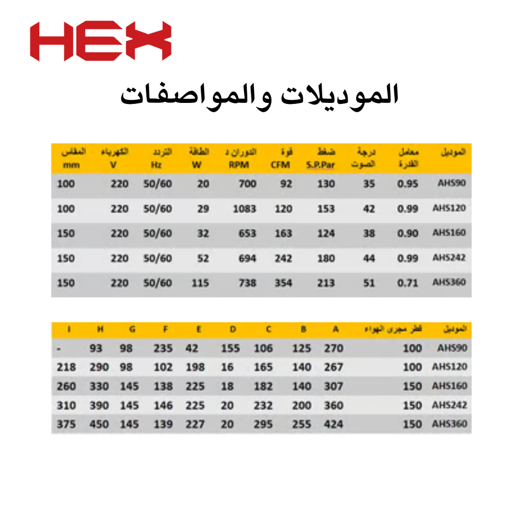 - AHS90 : قوة سحب 92CFM - مقاس القص في الجبس 24x24 - عمق المروحة ٢٠ سم - هيكل من المعدن المجلفن ضد الصدأ - مروحة مصنوعة من مادة ABS - مخرج 4 إنش - مناسبة لدورات المياه الصغيرة (1.5 متر * 2 متر )